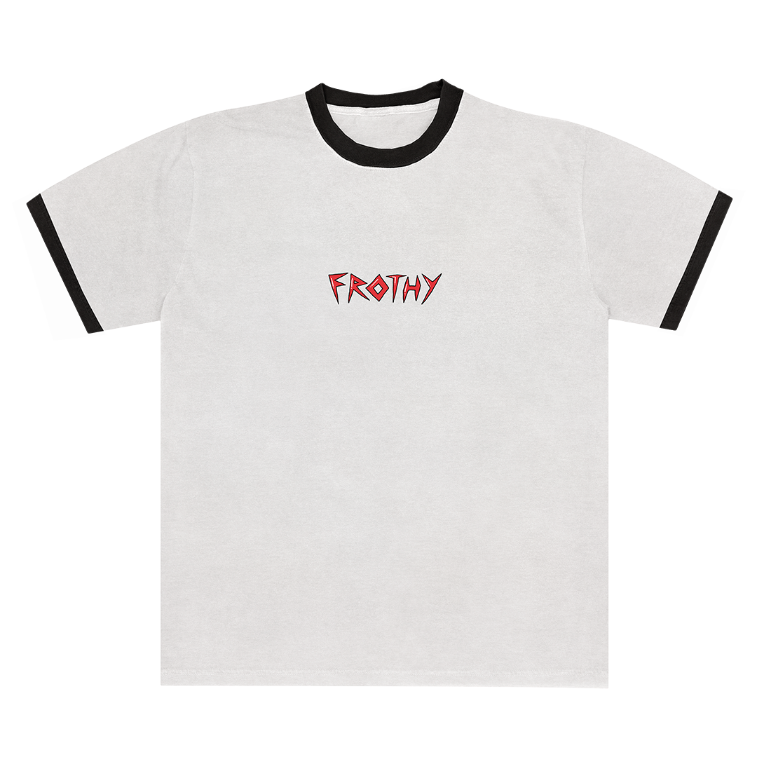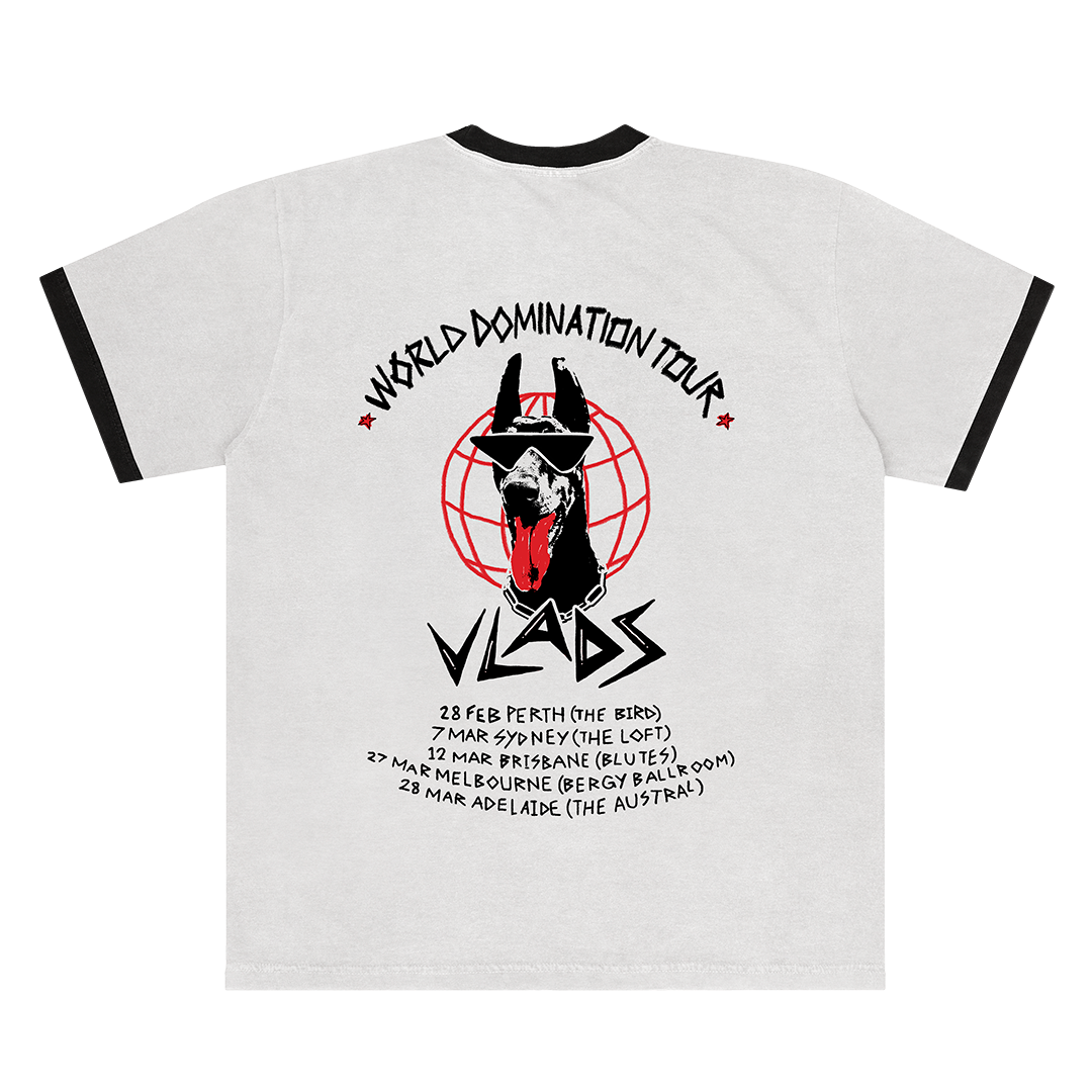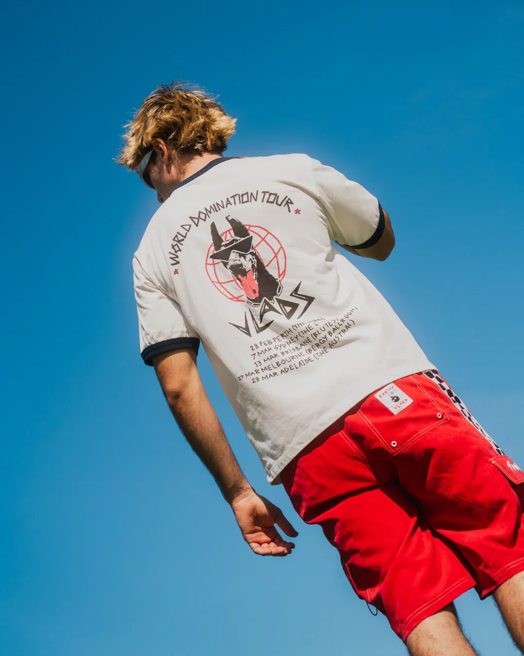 Most recently we collaborated with up-and-coming band VLADS on a new tee for their Australian tour. The Frothy x VLADS vintage tour tee features a ringer fit and a bold, impactful design built around the tour theme, “World Domination.” We used red to reflect the band’s new visual identity for the release of their debut EP. A recurring motif for VLADS is the long tongue, so we incorporated a dog with a long red tongue as a nod to that signature element for fans. It was a dream to work on another surf-meets-music collaboration with both FROTHY and VLADS.
